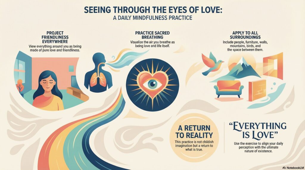 Notebooklm: In the video “An Effortless Exercise for Daily Life,” Francis Lucille teaches a spiritual practice centered on perceiving the world through the lens of universal love. He suggests that individuals should consciously visualize their surroundings and the air they breathe as being composed of this divine essence. While such an exercise might appear simplistic or childish, the author argues that it is a valid method for aligning one’s perception with ultimate reality. By viewing people, nature, and even inanimate objects as manifestations of love, a person can return to a state of truthful awareness. Ultimately, the source promotes a transformative mindset where love is recognized as the fundamental fabric of all existence.